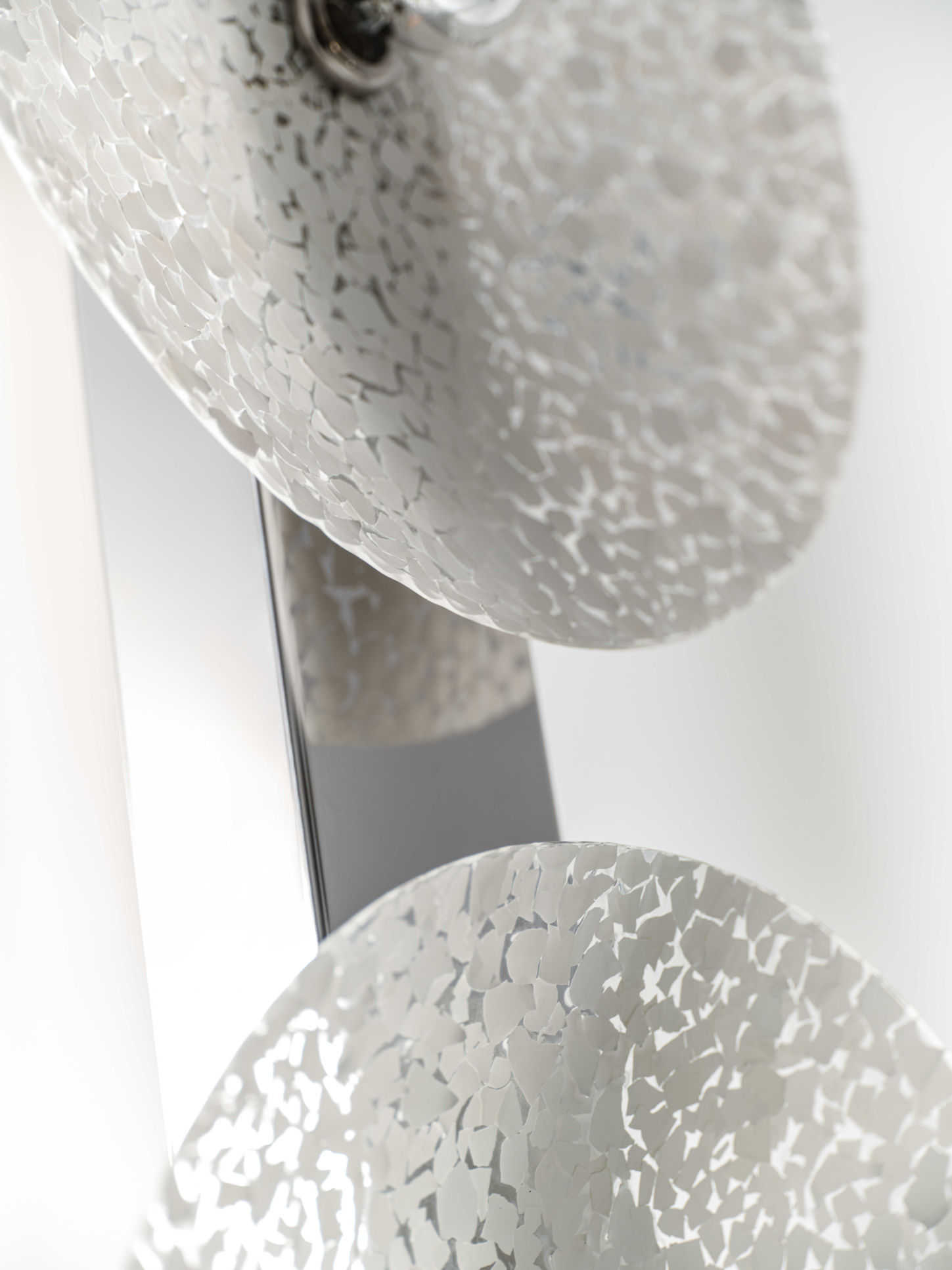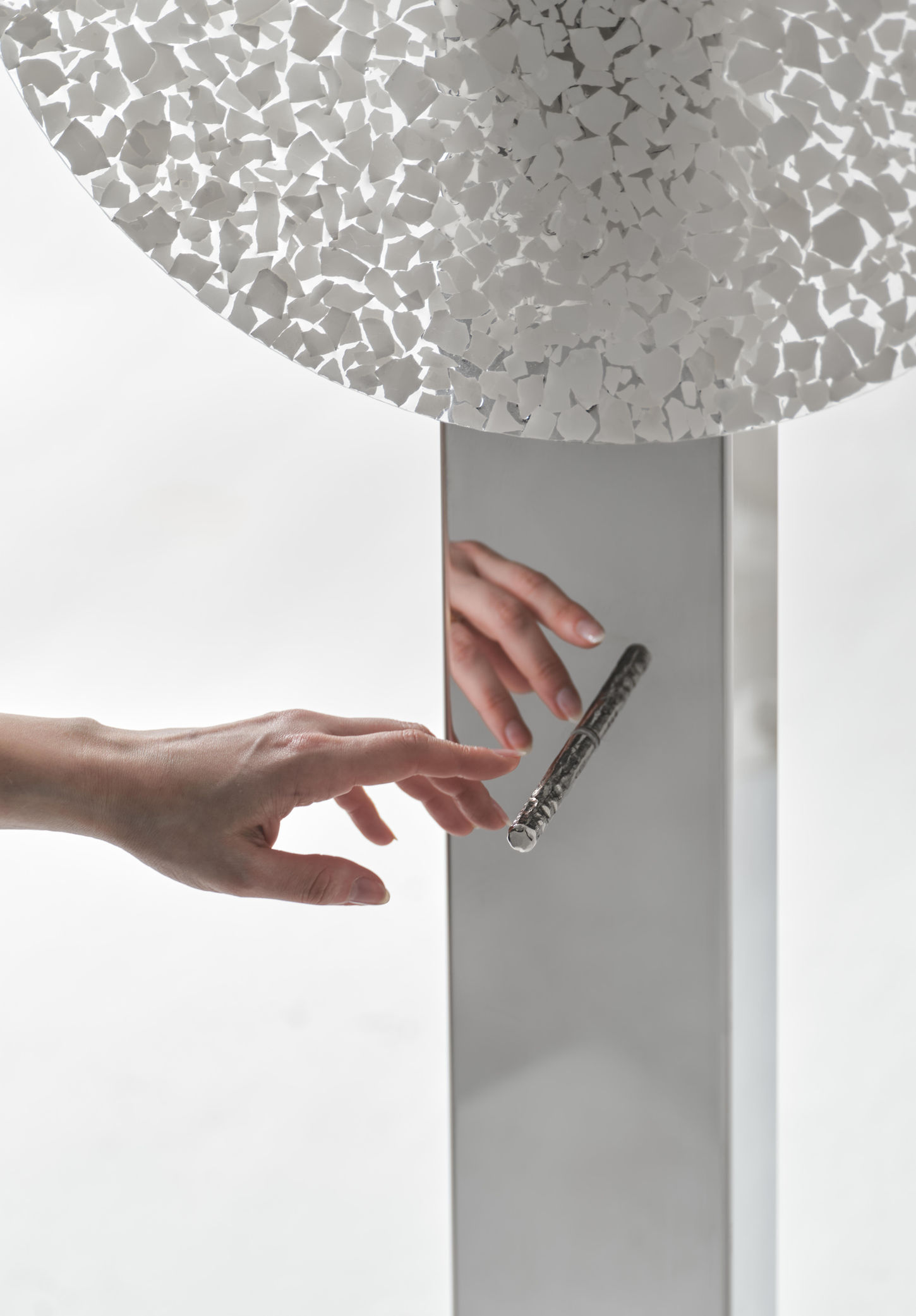 Inspired by traditional eggshell lacquerwork, Hatch employs transparent resin encapsulation to construct a layered, luminous surface, preserving the delicate material while achieving contemporary durability. Supported by a polished stainless steel column, the lamp’s structural contrast between organic fragility and industrial refinement underscores its sculptural impact.